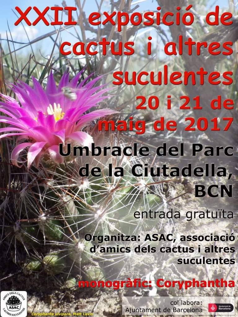 La XXII Exposición anual de cactus y otras suculentas que organiza ASAC, tendrá lugar el 20 y 21 de mayo, en el Umbracle del Parc de la Ciutadella, situado en Pg Picasso, 13, Ciutat Vella, Barcelona. Puedes pinchas AQUI para ver su localización.